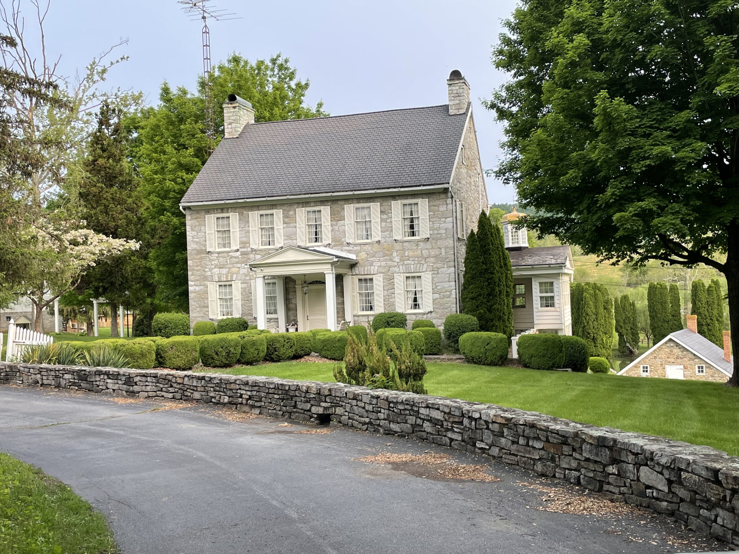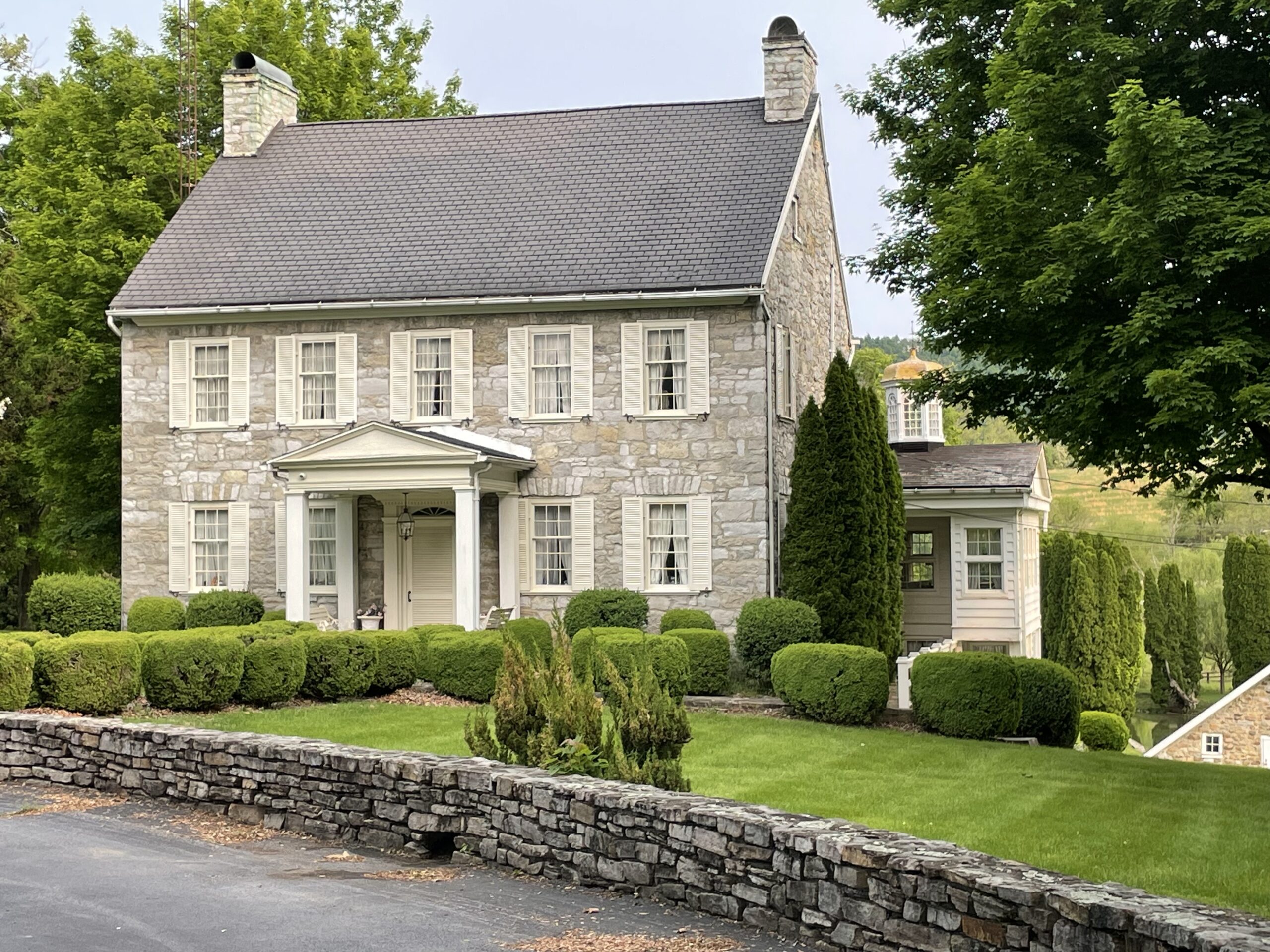 Ed and Katy Frye, along with their son Michael, continued with restoring and enhancing the property. They added the glass porch with the copper roof onto the house, repointed the stone on the main house, replaced the dam in the pond, replaced the roofs on all of the buildings. Katy, herself, laid a large portion of the stone wall around the pond.