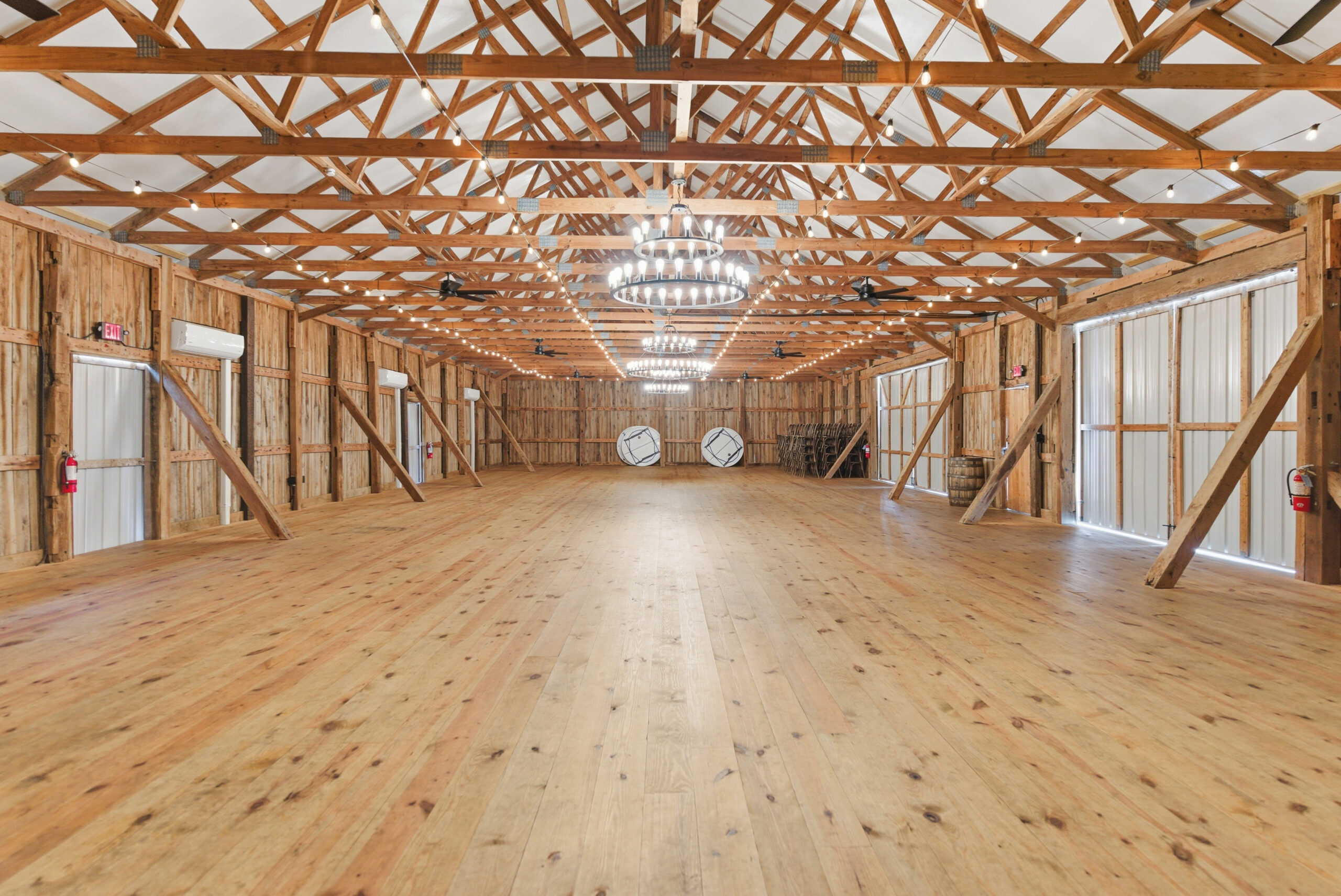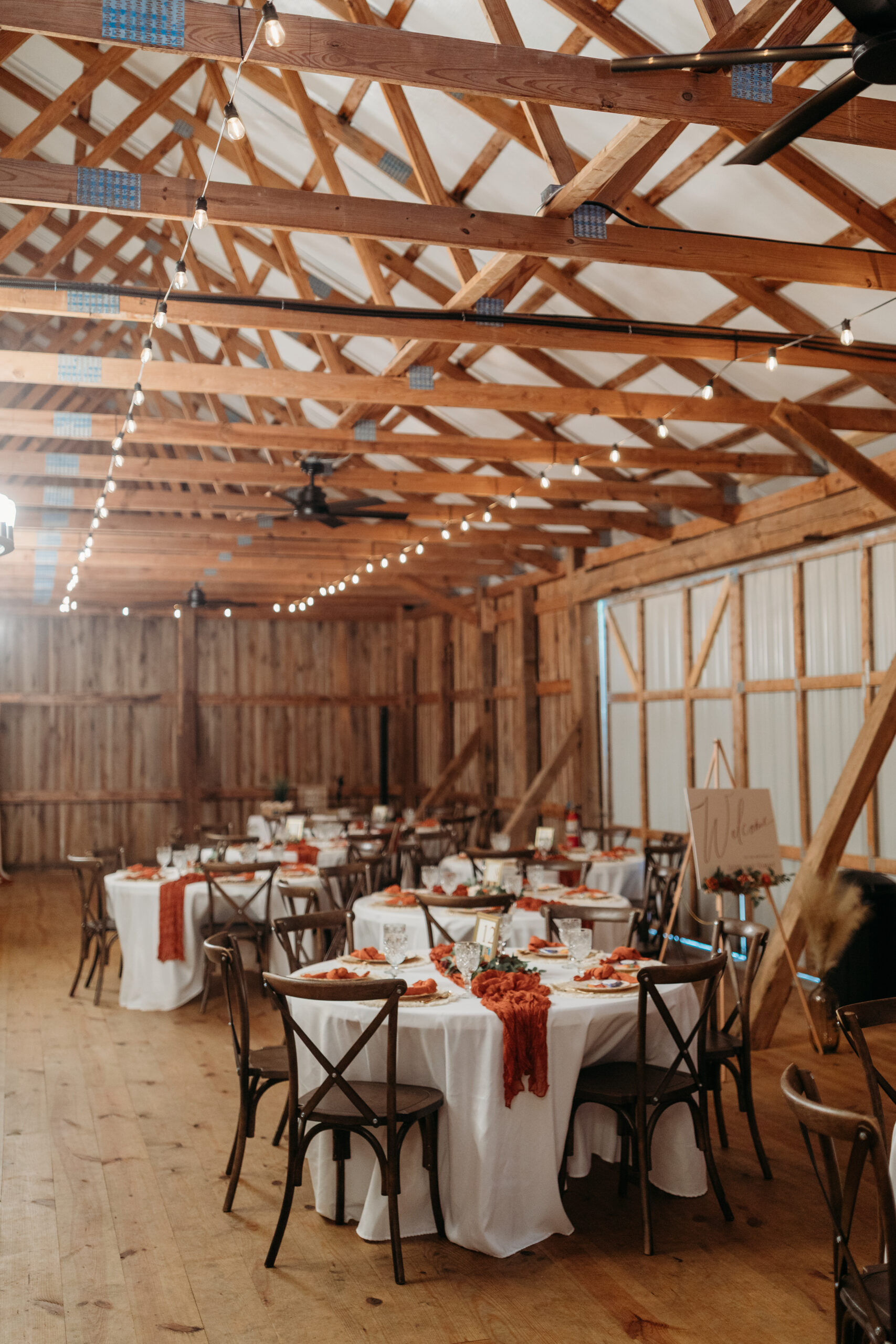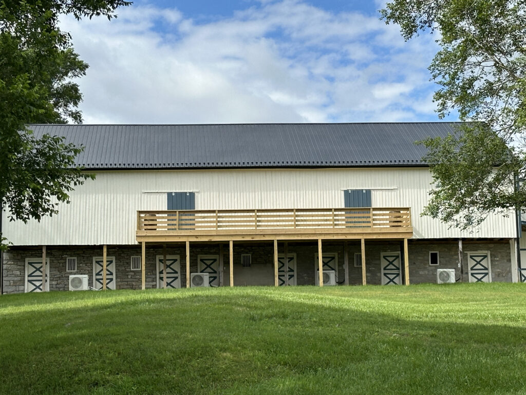 Heated and cooled bank barn with handicapped accessible restrooms, Bridal suite, Grooms lounge, 250 White resin folding chairs, 250 wood grain resin cross back chairs, round tables, rectangle tables, food prep room.